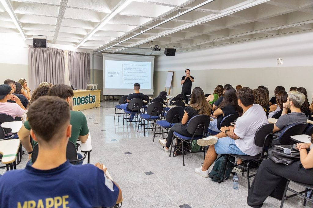 Na segunda-feira (06/02) a recepção aconteceu no auditório Jacarandá, piso 4, bloco B3. Lá, Tchiago acolheu os alunos e apresentou a estrutura dos laboratórios. Na terça-feira (07/02), acompanhados do professor Dennis Pereira, no laboratório de informática, puderam acessar e conhecer o funcionamento da plataforma Aprender no site da Unoeste, onde encontram os horários de aulas, materiais disponibilizados pelos professores, calendário e outros serviços.